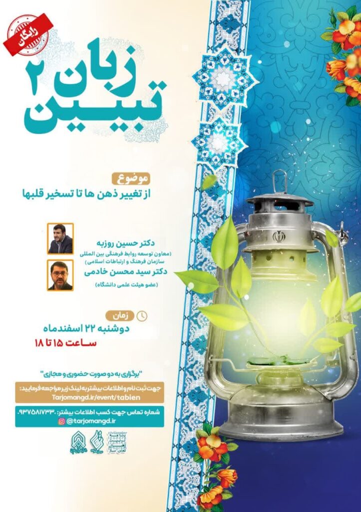 زبان تبیین ۲ با موضوع «از تغییر ذهنها تا تسخیر قلبها» با سخنرانی دکتر سید محسن خادمی و دکتر حسین روزبه، در تاریخ ۲۹ فروردین ۱۴۰۲ بهصورت مجازی برگزار شد.